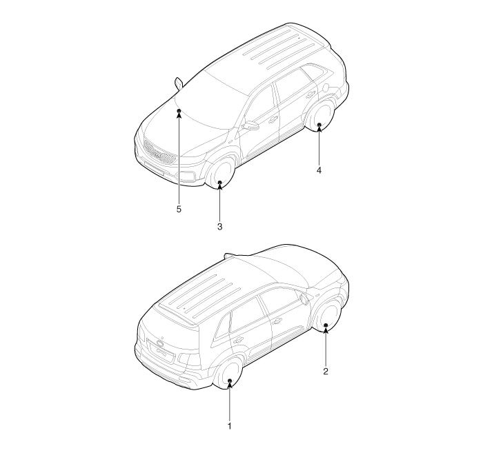 | 1. TPMS sensor (RR) 2. TPMS sensor (FR) 3. TPMS sensor (FL) |