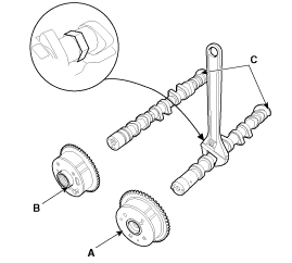 Install the intakeCVVT assembly(A), exhaust CVVT assembly(B) and camshaft(C).