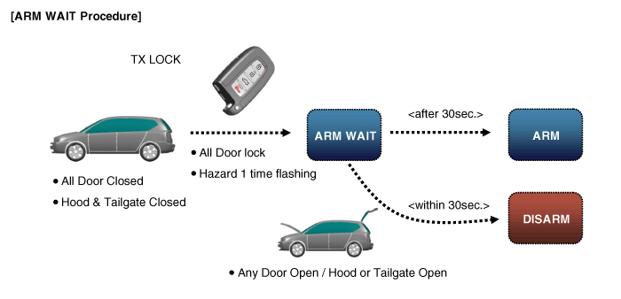 In "DISARM" state, no vehicle start inhibition. So, when door, hood, or Tailgate is opened, there is no alarm sound and flashing.