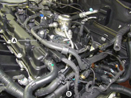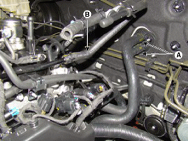 Disconnect the heater hoses (A) and brake vacuum hose(B).