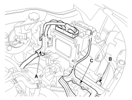 (B) and battery (+) wiring harness (C) after loosening the bolts and
