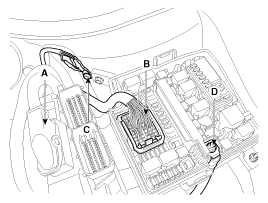 Disconnect the ECM connectors (A), front wiring harness (B), ground