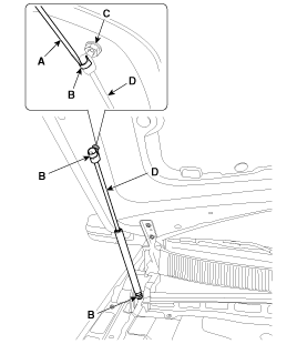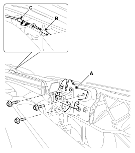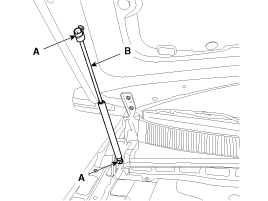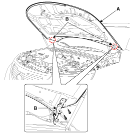 After loosening the hinge (A) mounting bolt, adjust the hood (B)