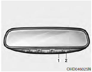 Press the I button (1) to turn the automatic- dimming function on. The mirror indicator light will illuminate. Press the O button (2) to turn the automatic- dimming function off. The mirror indicator light will turn off.