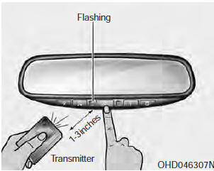 2. Press and hold the button on the HomeLink system you wish to train and the button on the transmitter while the transmitter is approximately 2-8 cm (1 to 3 inches) away from the mirror. Do not release the buttons until step 3 has been completed.