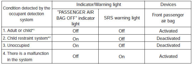 You will find the PASSENGER AIR BAG “OFF” indicator on the center facia panel. This system detects the conditions 1~4 in the following table and activates or deactivates the front passenger air bag based on these conditions.