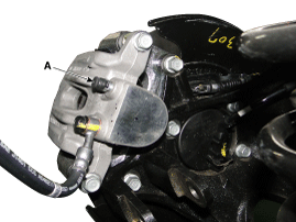 Loosen the right-rear brake bleed screw (A) to allow air to escape from the system. Then tighten the bleed screw securely.