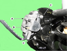 Loosen the hose eyebolt (B) and caliper mounting bolts (C), then