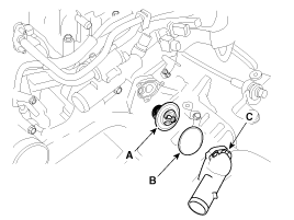 Remove water inlet fitting (A), gasket (B) and thermostat (C).