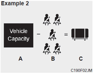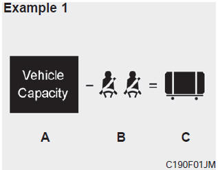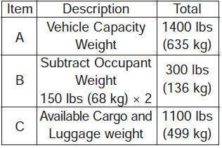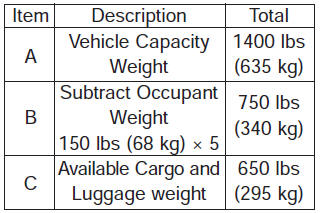 4.The resulting figure equals the available amount of cargo and luggage load capacity. For example, if the "XXX" amount equals 1400 lbs. and there will be five 150 lbs. passengers in your vehicle, the amount of available cargo and luggage load capacity is 650 lbs. (1400-750 (5 x 150) = 650 lbs.)